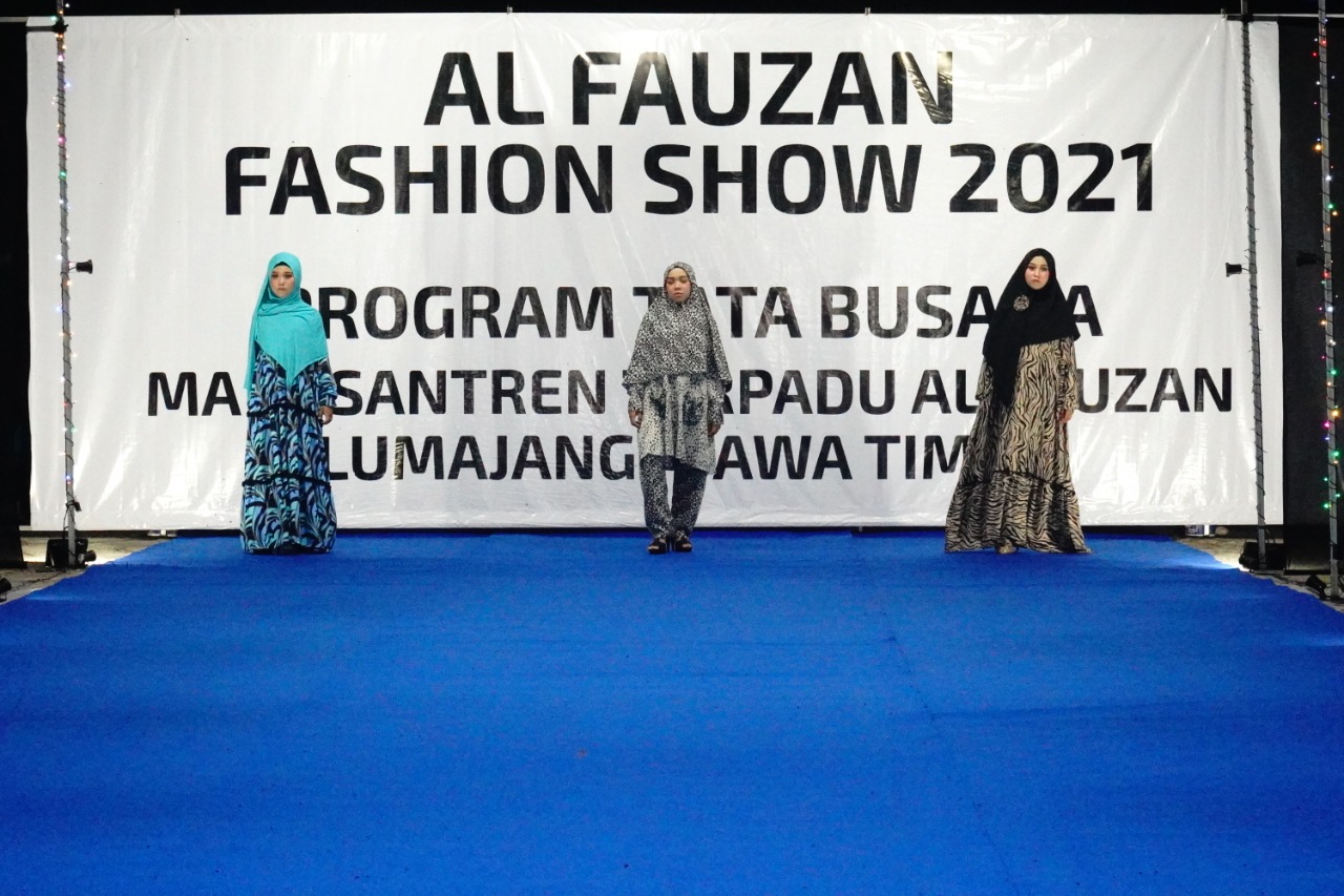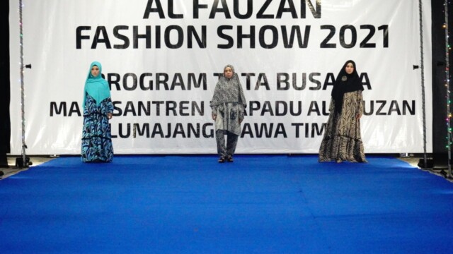 mtspesteralfauzan.sch.id – Lumajang. Untuk yang pertama kalinya, Al Fauzan Fashion Show diselenggarakan oleh program tata busana MA Pesantren Terpadu (Pester) Al Fauzan Lumajang. Enam belas jenis tema pakaian yang dipamerkan pada acara itu. Pada acara yang dihelat selepas sholat Isya tersebut, 41 santri berlenggak-lenggok di atas catwalk. Bak model, Sembilan belas santri dari MTs Pester Al Fauzan Lumajang tampil percaya diri berjalan di atas catwalk yang beralaskan karpet biru.